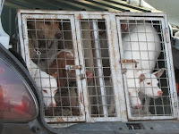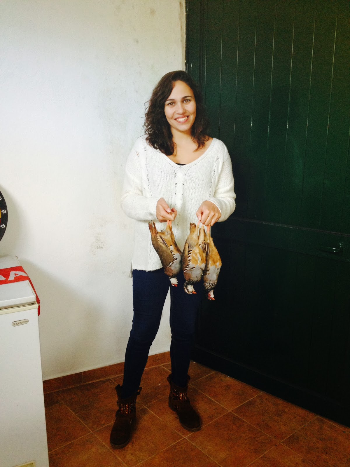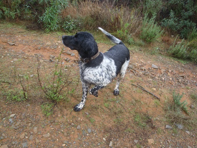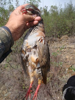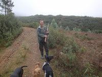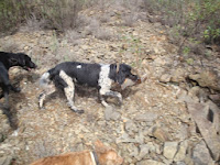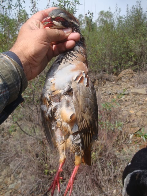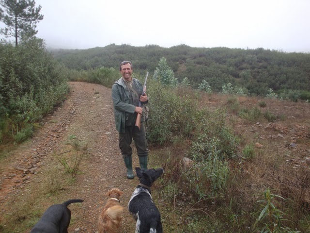 Começa a caminhada, homens e animais enfrentam o mato e……10 minutos depois, encharcado até aos ossos pela água depositada no dia anterior nas estevas, tojos e outras variedades da nossa flora local, o primeiro caso , um tiro, dois, mais e três e ainda mais dois indiciam uma peça de caça difícil de cobrar. Avisto-a ao longe, é um pombo bravo que desaparece no nevoeiro. Suspeito tratar-se de uma alma do outro mundo que, à quatro anos engoliu 150gr de chumbo(5tiros) e, cada vez que o tentava apanhar, levantava voo novamente tendo desaparecido sem deixar rasto. Sucediam-se os tiros, espaçados, mas ainda assim indiciando a existência de algumas vermelhinhas que nos vão proporcionando alguns lances de belo efeito, e alguns coelhitos desprevenidos que teimosamente vão “atropelando” O André – o mais novo do grupo que vai dando conta do recado com eficácia.