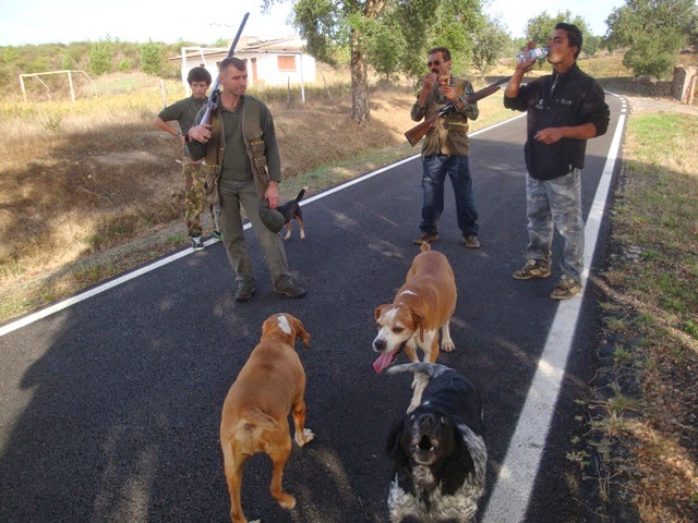 Retomamos o caminho de regresso. As estratégias, há muito definidas, resumem-se agora no retorno ao ponto de partida. Juntos, no regresso, os dois grupos avançam para a etapa final e, não eram ainda percorridos cem metros, junto a três ou quatro pinheiros jovens devidamente alinhados, três cães param de rompante assinalando a presença de caça nas imediações. Mestre Jorge e Mestre Abílio, algo surpreendidos com a ocorrência, não reagem em tempo útil e a bichinha, a coberto da flora local, dispara vale abaixo contemplada com dois “pregos” made in mestre A Lopes que, perante a clara falta de eficácia, se alistou de imediato no núcleo da Avessada dos “protectores da fauna local”.