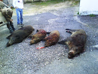 Nos últimos dias os ventos frios talvez tivessem obrigado os porcos a mudar de encames ou então teriam tido uma visita de um “amigo” que lhes teria dito para se mudarem pois vinham aí tempos difíceis, são as condicionantes dos terrenos abertos.Ainda assim compareceram na junta de carnes quatro javalis sendo dois deles de bom tamanho, todos fêmeas, o que leva a que se possam tirar algumas elações a respeito de fazer montarias tão tarde no calendário venatório pois o que se verifica é que as varas são compostas no essencial por juvenis e fêmeas quase todas prenhas, estando os grande machos já fora da época do cio, recolhem-se nos matões e é muito difícil aparecer algum às portas.O repasto mais uma vez confeccionado pelo amigo César, ombreado pelo amigo Carlos Contino, foi uma boa feijoada de javali, acompanhada pelo bom vinho da região (do amigo Victor Gonçalves) com sobremesa composta por queijo do Alentejo, digestivos café e aguardente de medronho, tudo do melhor.